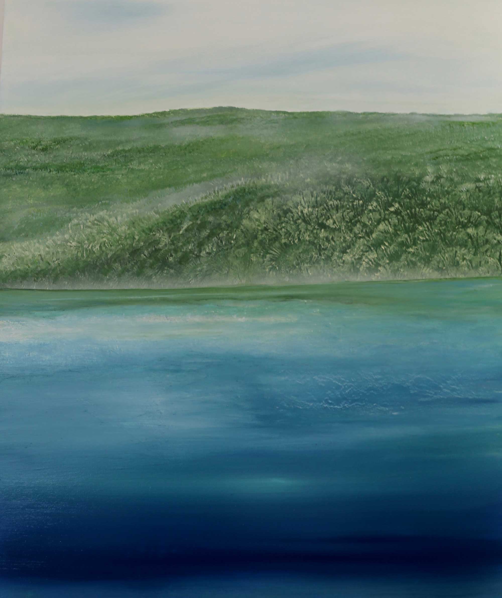 This painting is from a memory of sailing in the Lesser Sunda Islands in Indonesia, where life is blissfully untamed and so rich in vegetation and colour. It is like a moving image or a quick shot in motion from the sea towards land.